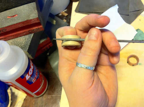 Utilice papel de lija para suavizar abajo cualquier esquinas agudas en los bordes del anillo. Si usted tiene apuro el conseguir lija dentro del ring, puede utilizar un archivo pequeño. Lijar y redondear los bordes de la ranura si estás haciendo una incrustación.