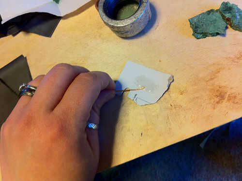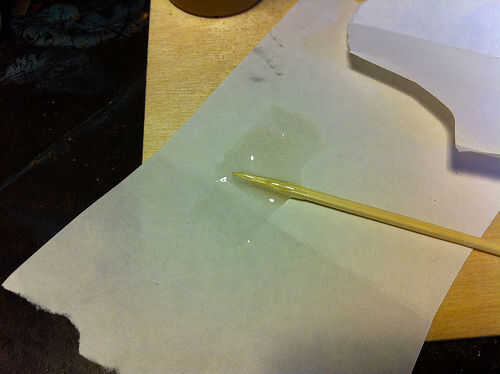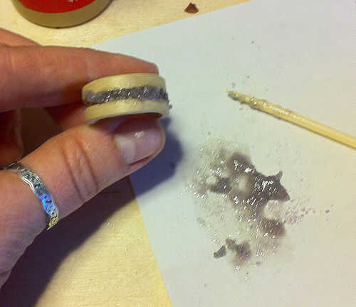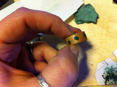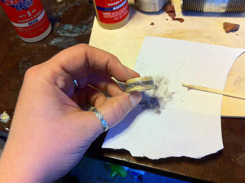 Presione la mezcla de piedra en los huecos de su anillo con su palillo. Squash en cuidadosamente y a fondo. Después de que utiliza el palillo de dientes, pongo un poco vaselina en mis dedos para eliminarlo en más. Raspe tanto exceso como usted puede mientras que mantiene la mezcla piedra ligeramente por encima de la madera superficial en el ring. Se ahorrará un poco de tiempo si usted también raspa el epoxi de la madera superficial tanto como usted puede mientras que ha mojado.