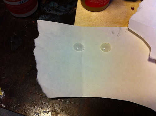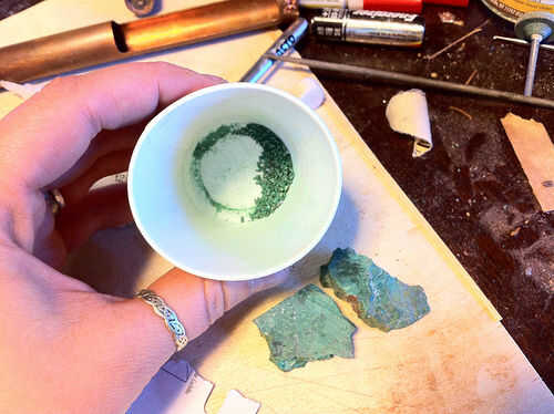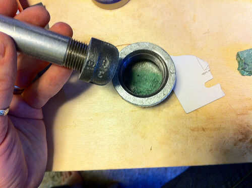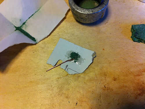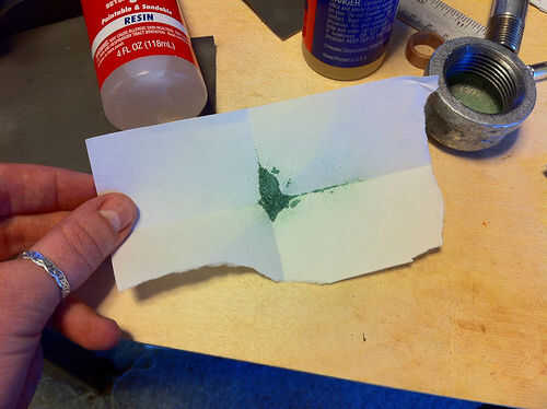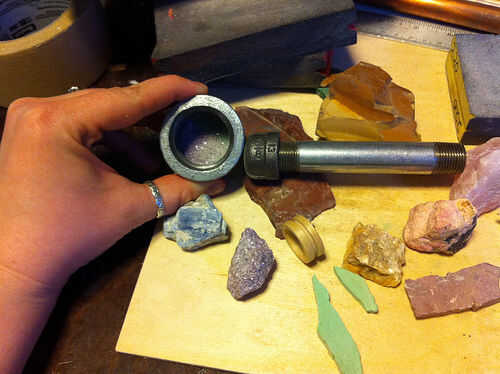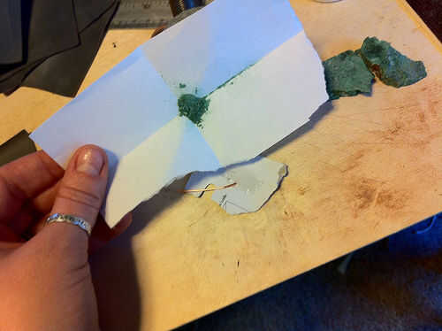 Utiliza un martillo y yunque o lo que sea para romper la roca solicitada en polvo. Josh compraron algunas guarniciones de la plomería en la ferretería para romper la roca. El casquillo del metal más grande contiene los pedacitos de roca para que no vuelan en el lugar cuando yo les estoy rompiendo. Doble un pedazo de papel por la mitad longitudinalmente. Despliegue y pliegue transversalmente. Se despliegan. Esto crea valles que hacen más fácil mantener la piedra en polvo donde usted lo desee. La piedra triturada en el centro del papel donde se intersectan las líneas de descarga.