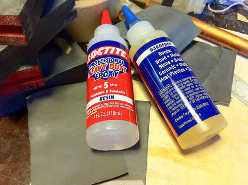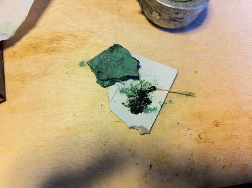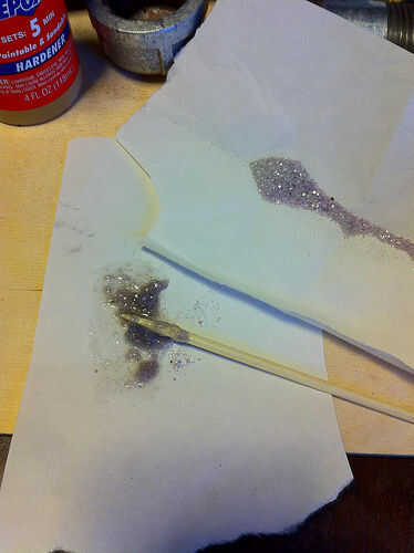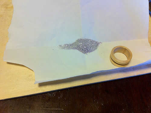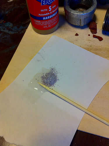 En otro pequeño pedazo de papel, el chorro de partes iguales de ambas partes del epoxi. Se mezclan bien con el palillo de dientes, tratando de evitar la adición de un montón de aire. Verter un poco de piedra machacada y mezcle. Añadir bastante piedra que tendrás puntos claros vacíos en su epóxido cuando está en el ring, pero no tanto que el epoxy no puede sostener todo junto.