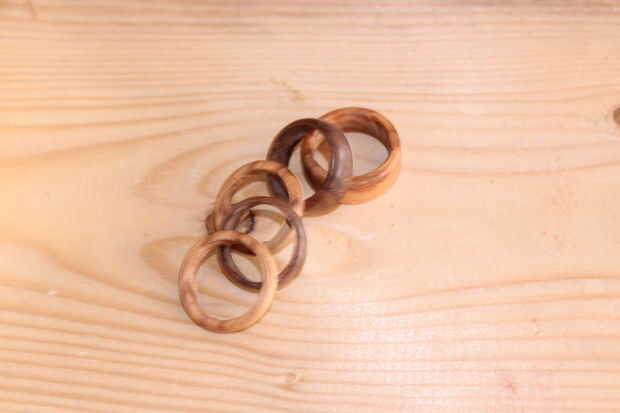 Los anillos en la foto son de nogal y nogal americano. No he probado estas de madera blanda como el pino, pero no creo que trabajan bien tanto palo a una madera dura.