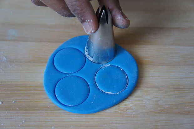 2) con la punta de la tubería de 1 M hacen pocas formas circulares en el fondant laminado