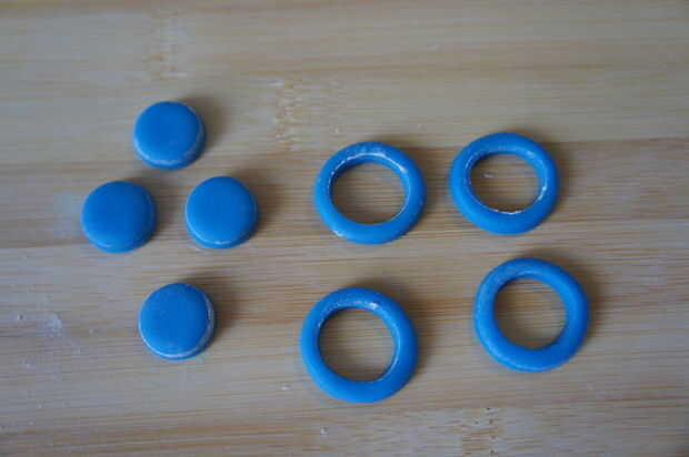 4) rollo de diferentes colores de fondant y cortar tantos anillos como sea necesario. (Para cada color que hice 4 anillos)