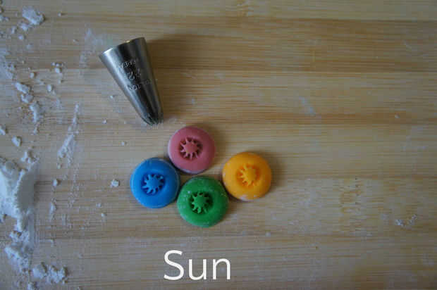 2) con la punta de Wilton 22 (punta estrella) Presione el pastillaje (fondant) y separe la punta lentamente haciendo un diseño de sol