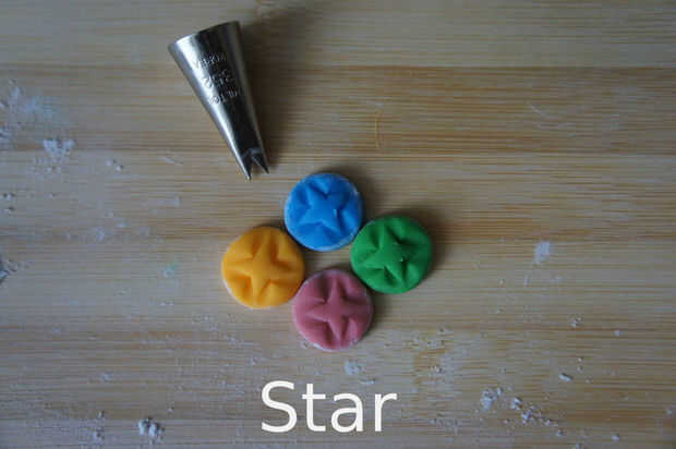 2) con la prensa de punta (punta estrella) de 1 M de Wilton en el cilindro de pastillaje (fondant) hasta la parte inferior