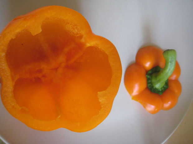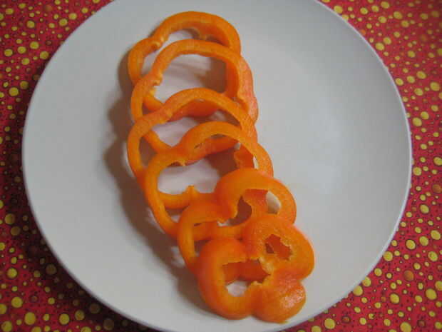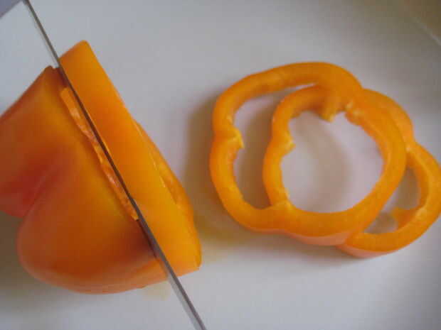 ~ Cuidadosamente cortar el pimiento en aros gruesos de 1/2 pulgada
