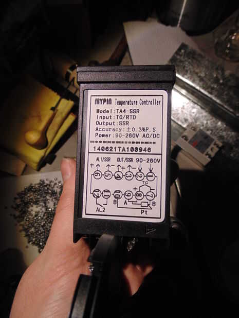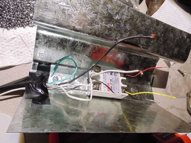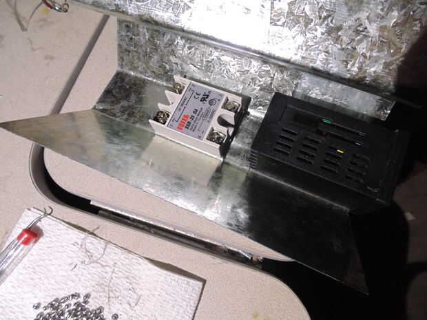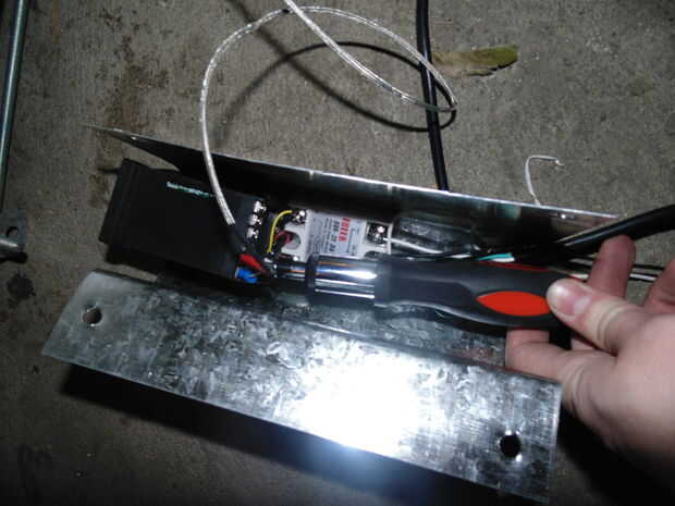 - En la sección plana que se convertirá en la parte inferior, el tornillo en el Relais de estado sólido. Asegúrese de que el el "+" & "-" terminales y no el "~" terminales estén orientadas hacia el lugar que sea el regulador de PID.