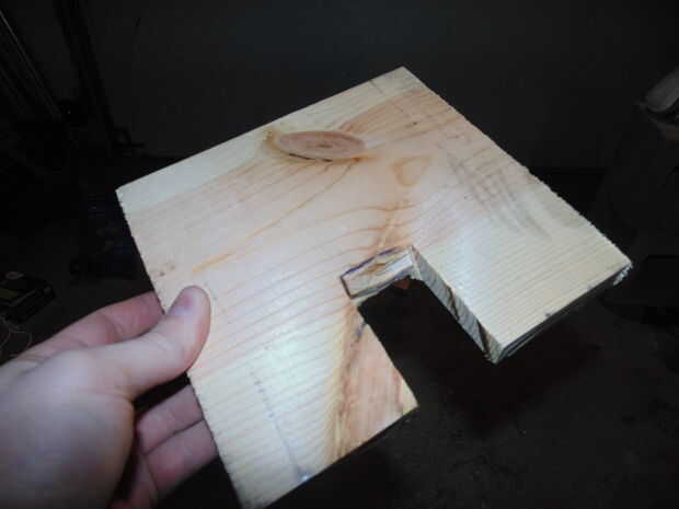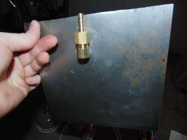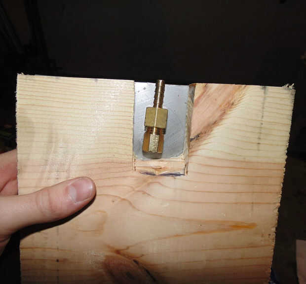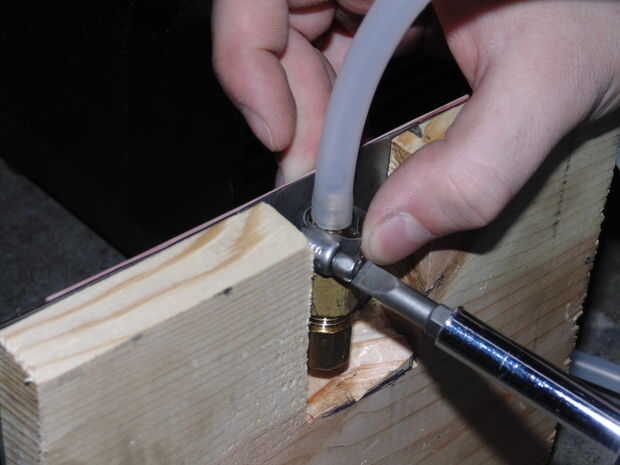 - Enrosque el codo de 90 grados en el agujero, usando el lado nacional del hilo de rosca de pipa (NPT) hasta que sobresale menos que el grueso de la tablita de madera. Fije la lengüeta de la hembra en el otro extremo.