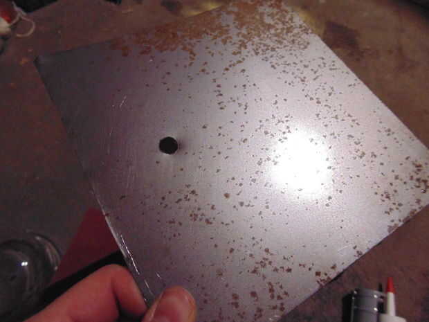 - Perfore un agujero de cerca de 1.5" de un extremo de la placa de acero lo suficientemente grande como para la articulación del codo del hilo de rosca.