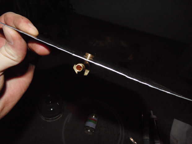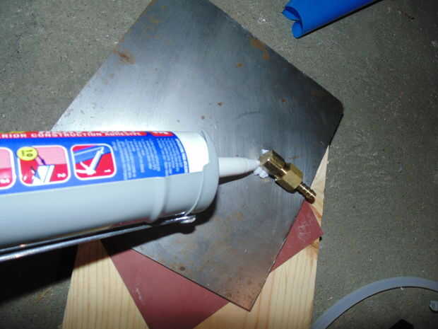 - Corte un agujero en la Junta de goma para que alinee con el espárrago que sobresale en la parte superior de la placa. Tomar caucho cemento y aplicarlo a la Junta de goma y luego presione a la Junta en la placa de acero (mantener la presión sobre el mismo hasta que se seque; se quiere rizar). PRECAUCIÓN: Cemento de goma produce gases que no son buenos inhalar - use ventilación adecuada al usarlo.