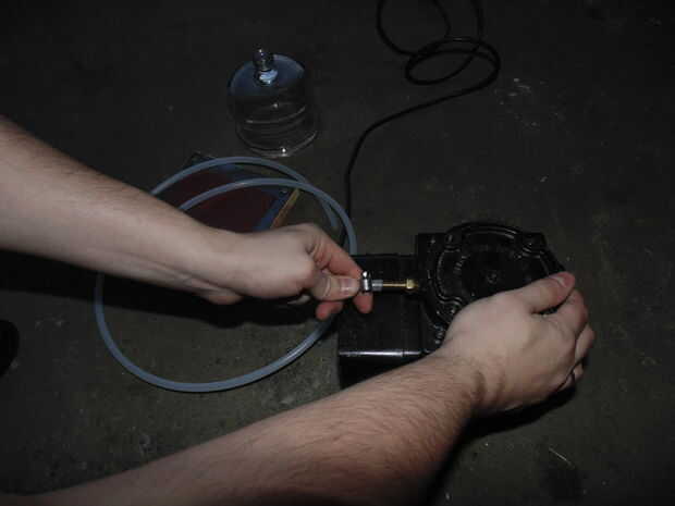 - Moje el borde de la campana y coloque en la Junta de goma. Encienda la bomba (o el grifo de agua para el hidromasaje aspirador) y admirar su nueva cámara de vacío! Esta cámara obtiene alrededor de 25 en Hg de vacío dependiendo de qué tan bien está sellado.