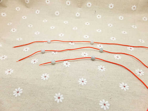 Paso 1: Cortar las tres piezas de cuerdas que son al menos 50 cm de largo. Mantener cada pieza de la misma longitud de cable y cadena dos las cuentas de jade jadeíta.