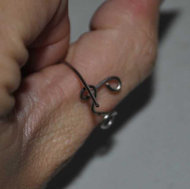 a la medida de la banda, envuelva el anillo alrededor de cualquier dedo quiere que vaya en el. Cuando haya decidido cómo es grande usted lo desea, trabajar hacia atrás aproximadamente medio centímetro de encuentro el alambre enderezado y el L. Hacer una curva cerrada con sus alicates de punta.
