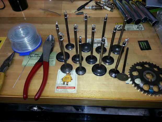 Obtención de las válvulas de una cabeza de cilindro y un engranaje de árbol de levas como se muestra requieren herramientas especializadas que yo no cubriendo en detalle en este Instructable. Es todo depende de su habilidad mecánica y el conocimiento. (o amigos que pueden ayudar :) Por lo menos necesita un compresor de resorte de válvula. Quitar los engranajes del árbol de levas de los motores requiere una llave para sujetar el árbol de levas mientras una carraca grande y toma retirar el engranaje del árbol de levas perno de retención. Estas piezas fueron tomadas de motores de importación moderno que habían fallado. Una vez que las válvulas de un motor y algo adecuado para colgarlos de, el resto de esta construcción es bastante fácil y ser creativo!!!