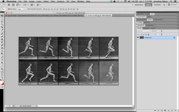 Elegí esta serie de fotografías, porque cada uno tiene el hombre corriente centrado, es disparados desde el mismo ángulo y es del mismo tamaño en cada uno. Hice una nueva capa por cada fotograma y los comprometidos por lo que pude experimentar con que Marcos haría para la animación más convincente-usted puede hacer esto superposición de sus marcos y las capas prendiendo y apagando en secuencia. Luego corté el fondo de cada imagen para que más adelante podría utilizar las siluetas.