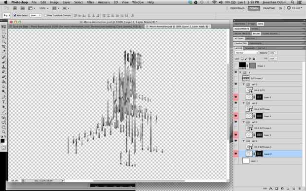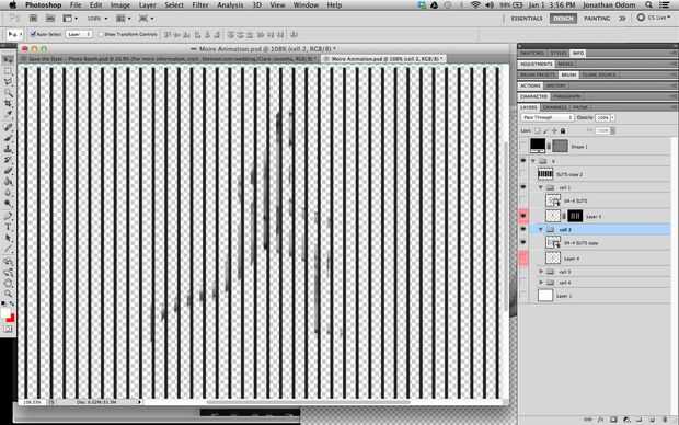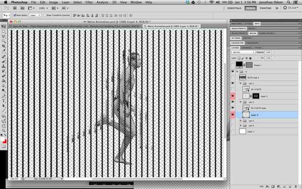 Hice una capa con las líneas negras de estas dimensiones como una manera de obtener rápidamente la máscara para cada uno de los cuadros de animación:. 04" negro líneas espaciadas. 125" aparte. Solo CMD + clic en el capa y obtener la selección necesita, a continuación, seleccione el fotograma que desea enmascarar en la Ventana de capas y haga clic en el icono en la parte inferior de ese panel que es un rectángulo con un círculo en el mismo. Esta máscara de la capa seleccionada con la selección que hiciste. Repita este paso para cada una de las 4 capas, pero por supuesto a mover la máscara a la derecha por. 04" para cada capa.