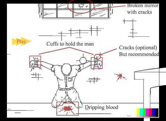 El hombre sido esposadas y su cabeza mirando hacia abajo muestra que la persona fue golpeada y atada para arriba. Para añadir un efecto adicional a la situación se ha añadido sangre en el piso. Senderos de sangre opcional en las paredes, incluso puede Agregar en sus brazos y torso.