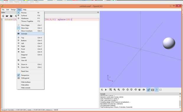 OK, aquí vamos! Animaciones en OpenSCAD están controladas por la variable de sistema $t. Durante una sesión de animación $t comience en 0 y se basa en algunas entradas se tomará pasos tamaño igual a 1; Por ejemplo, si le decimos a OpenSCAD que nuestra animación tiene 10 pasos, $t tomaría los valores 0, 0.1, 0.2, 0.3, 0.4, 0.5, 0.6, 0.7, 0.8, 0.9 y tal vez 1 (parece que a veces lo hace y a veces no va todo el camino a 1). En cada paso OpenSCAD hará el equivalente del menú "Vista previa". Así que si hacemos una transformación dependiente de $t la forma transformada aparece moverse.