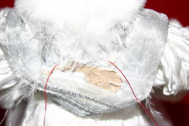 Hágale un agujero a través de la espalda del ángel.  Inserte el cable (Yo utilicé alambre de Magneto #24) a través de este agujero.