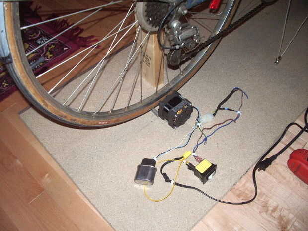 Conecte el motor a la base, para que el neumático trasero de la bicicleta se apoya sobre el eje del motor. Usé dos soportes de metal de 90 grados para sostener el motor. Asegúrese de que usted monte el motor para que la rueda de bicicleta vuelve hacia atrás cuando el motor está funcionando, de lo contrario no gira los pedales! Deberás ajustar el ángulo del eje del motor para que la bicicleta presiona ligeramente contra el soporte posterior cuando se ejecuta. Para ello, afloje los tornillos que sujetan el motor a la base y gírelo ligeramente y vuelva a apretar.