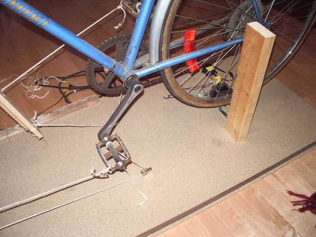 Atar cuerdas entre la bicicleta de pedales y una palanca en cada lado. No uso sedal para esto, algo más pesado, habrá mucha fuerza una vez que todos los maniquíes se enganchan para arriba. Coloque las poleas en la base debajo de los pedales y atar cuerdas más entre los pedales y las otras dos palancas a través de las poleas. La idea aquí es que usted tendrá dos conjuntos independientes de palancas, por lo que todos los movimientos dummy no están perfectamente sincronizados. Esto hace que la pantalla buscar un poco más interesante.