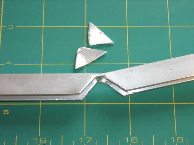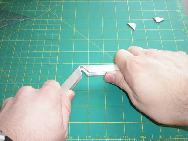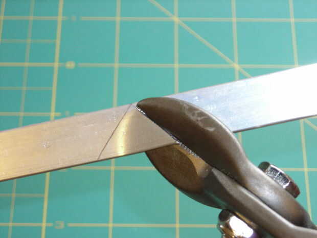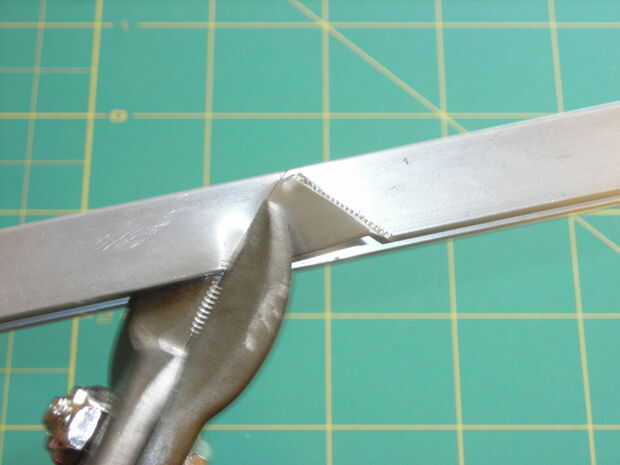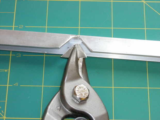 Corte ahora a lo largo de las líneas con las tijeras (se puede utilizar una sierra para metales, pero sería muy difícil) y después corte la parte de atrás para emparejar (ver fotos).