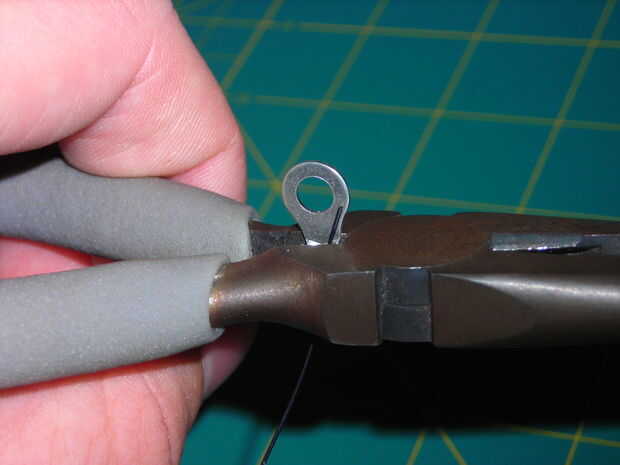 A continuación, fije los plegadores del Flexinol roscar el Flexinol en el orificio de engarce y pellizcando cerrado. Para ello he utilizado el espacio en un par de pinzas entre las asas (Fig. 2), en vez de comprar una crimpadora. Para ello en ambos extremos.