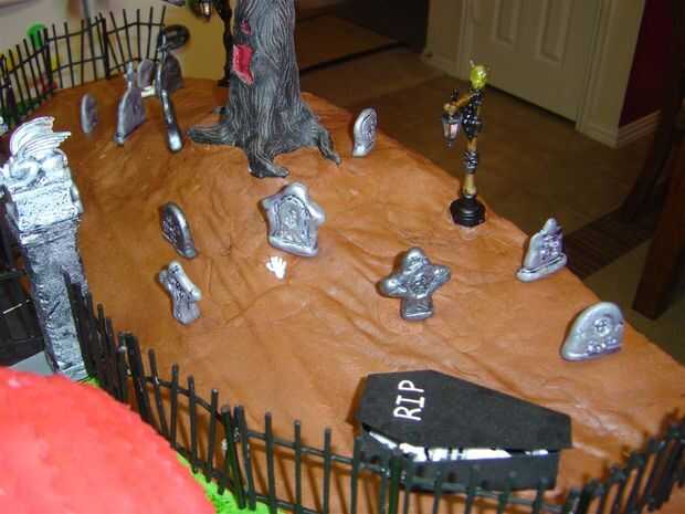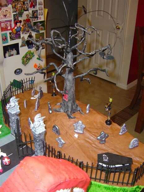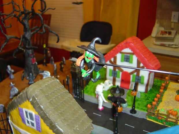 Los murciélagos y los fantasmas solo se enganchan directamente a los ejes enganchados a los motores. Estas fueron tomadas de niños anillos de Halloween. Muy fácil. Era más difícil ejecutar el eje el árbol pero lo conseguí sin problema. Lili había moldeado a la bruja volando alrededor de la casa central. Resultó muy lindo pensé. Otra vez, enganchado directamente a un motor por debajo de la torta. El árbol iba originalmente a ser un árbol spooky Lemax pero no era casi bastante grande para lo que queríamos así que moldeamos nuestra propias usando Sculpy. Sólo deseo que había pensado en eso antes de tiempo y añadido unos ojos brillantes. No tengo cualquier pequeño LED por la noche que tomamos esa decisión. Sí, necesito stock para arriba en más basura, por si acaso.