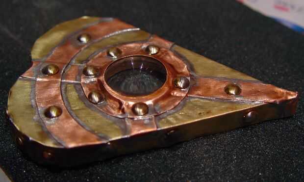 Luego cubre la plancha con cuña de latón, cobre y utiliza una lente de vidrio (también del escáner proviene el motor) para ' punk para arriba '. Sólo puede manchar la madera.