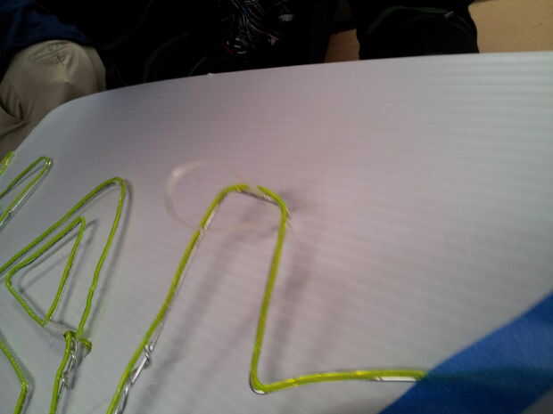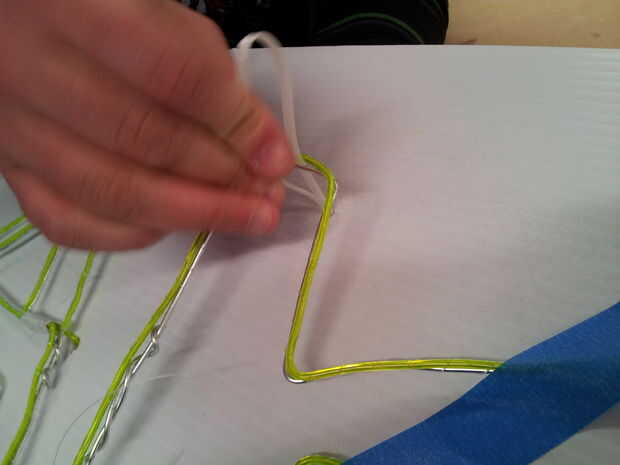 Una sujeción de cable de la parte posterior a través de cada orificio del hilo de rosca. Deslice la punta de la atadura de cables entre el arte y el alambre EL alambre para que no bloqueen el EL alambre. Tirar el lazo de cable a través del mismo agujero en la parte posterior y asegúrelo. Hacer esto hasta que todas las cartas están aseguradas y cortar las bridas. Asegúrese de empujar los extremos del conector de EL alambre en la parte posterior.