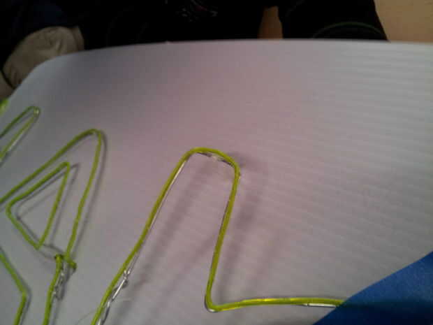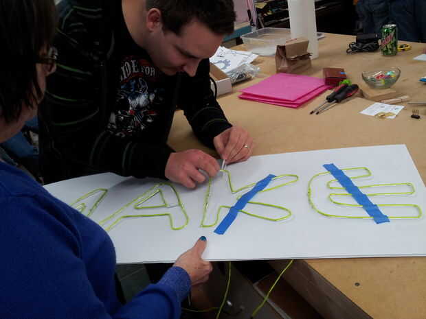 Cuando usted tiene su diseño final, marque los lugares donde deben ir los cables en la parte posterior. También Marque tantos como sea necesario para garantizar las letras. Perfore agujeros en el tablero con un punzón o cuchillo.