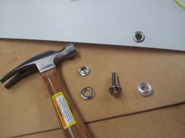 Los ojales que compramos en una tienda de artesanía local vinieron con instrucciones (tuyo probablemente también lo hará), pero el proceso es bastante simple. También vinieron con una base y una herramienta de abocardar.