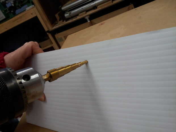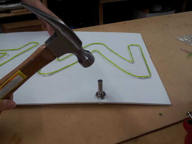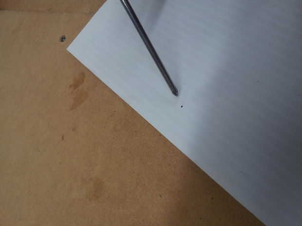 Empezar marcando el signo donde desea su agujero para ser. A continuación, usted necesitará hacer un agujero lo suficientemente grande como para acomodar su ojal. Hicimos esto empezando con un destornillador y luego cambiar con una broca de paso.