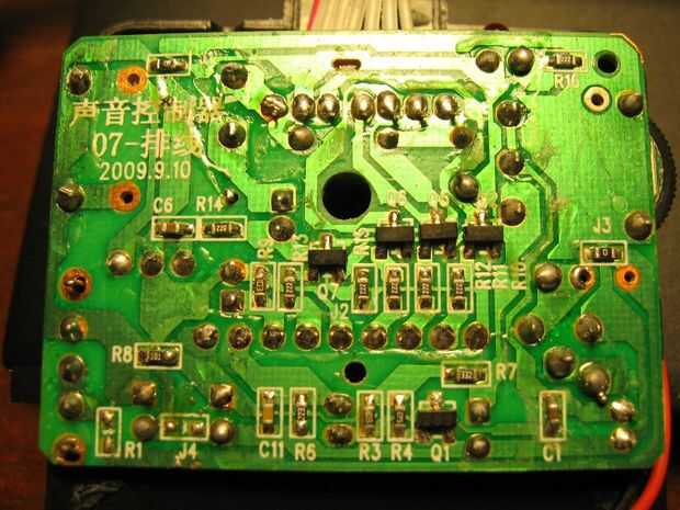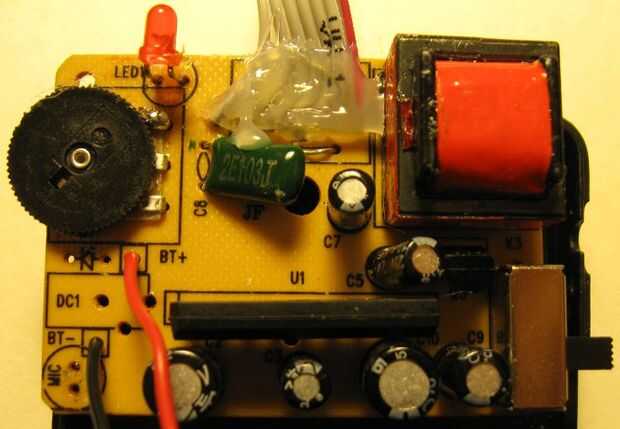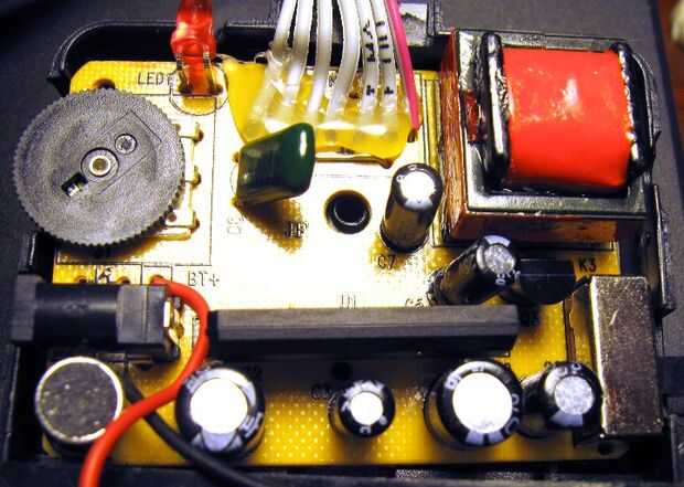 Sólo he trabajado con uno de estos inversores, así que no puedo decir la probabilidad de que vas a tener uno como el mío. Espero que estas modificaciones son lo suficientemente genéricas como para que usted será capaz de aplicar a un inversor de diferentes. Primero quitar los tornillos que sujetan la caja del conversor juntos e inspeccionar la placa de circuito. El bote de sensibilidad alimenta potencia al amplificador interno del micrófono de electret. La salida del micrófono de electret luego se acopla capacitivamente a un amplificador de transistor único (M28S) inversión. La salida del transistor se acopla capacitivamente al conductor EL IC. Para hacer espacio para el cable de audio quité la toma de barril. Notas de ratón la imagen para ver los lugares en el tablero que estoy describiendo.