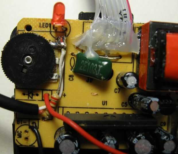 Encontré que la dinámica del panel cubierto su gama completa muy bien cuando la entrada de señal de audio se encontraba en un nivel de escucha que está ligeramente debajo de lo normal. Esto significa que si el volumen se incrementó a un nivel normal o alto que el panel se cubrió al rojo la mayor parte del tiempo. Por lo tanto decidí reutilizar el potenciómetro para atenuar la señal de audio antes de entrada al amplificador de transistor inversor. Para ello corte el rastro que conecta las piernas altas y medias de la olla y un cable del canal audio izquierdo conectado a la pierna superior y audio tierra a tierra de la placa de circuito. Ahora la rueda de ajuste permite el control de gama dinámica del conductor sin tener que cambiar el volumen de la música escucha. Mi 2da generación ipod shuffle tiene una salida de ruido, por lo que hace que EL nivel más bajo hilos de la luz hasta incluso cuando no está jugando música. Usando la rueda de ajuste para aumentar la resistencia de entrada corrige este problema.
