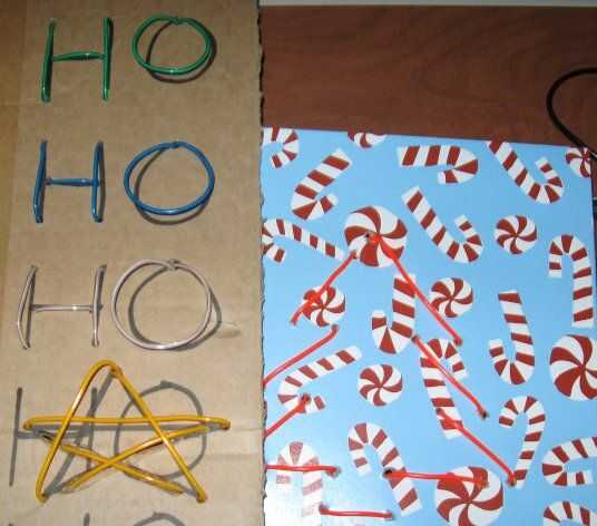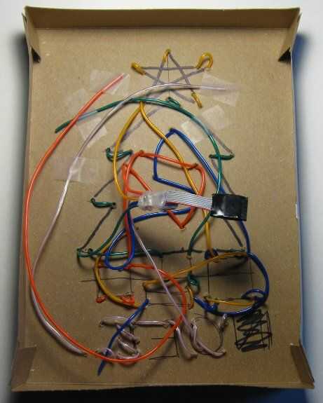 A continuación, elegí lugares a lo largo del patrón de agujeros para EL alambre a través. Este paso toma algún pensamiento ya que es necesario determinar donde a lo largo del patrón EL alambre fuera o dentro de la caja. Por supuesto, cuando EL alambre está dentro de la caja se no puede ver por lo que podría alterar el patrón. Agujeros es algo que conseguir una sensación para a la práctica. Me pareció la mejor herramienta para perforar los agujeros un destornillador de estrella porque podría ser utilizado para perforar el cartón sin tener que preocuparse por un punto agudo. Si encuentras que una parte de su patrón requiere colocar los agujeros demasiado juntos, considere el uso de cinta aislante negra para bloquear parte del cable. Por ejemplo, el punto en la parte inferior de un signo de exclamación es difícil hacer enroscando el alambre a través de agujeros perforados, pero un poco de cinta aislante negra funciona muy bien para bloquear un poco de alambre y crear el espacio entre el "palo" de la "bola".