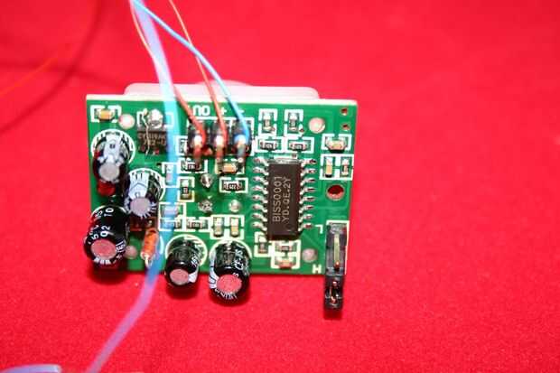 Obtener un sensor de movimiento de paralaje (de Radio Shack o Parallax.com).  Conecte un alambre de envoltura de cable rojo al borne positivo (un pequeño nudo en el otro extremo para que se sepa es el cable positivo del lazo).  Envolver un alambre azul alrededor de la terminal negativa.  Envuelva el otro cable rojo (sin nudo en el otro extremo) a la terminal de salida.