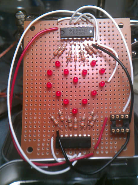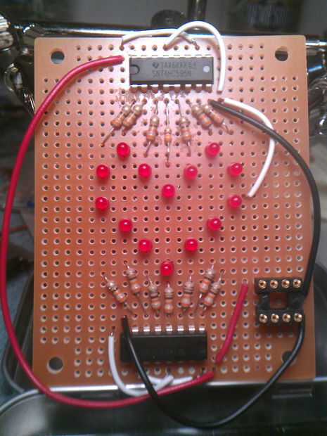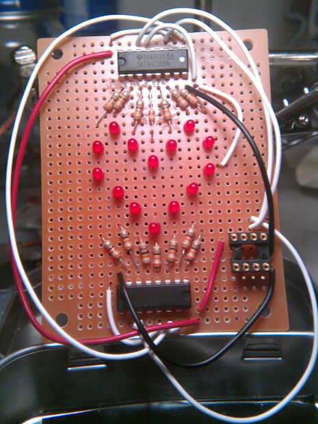 Entonces soldó en los cables de control de registro de cambio. Reloj serial en ambos registros está conectado al mismo pin en el microcontrolador (pin 6, 1 digital), y reloj de registro en ambos registros es conectado al mismo pin (pin 7, digital 2). Datos en serie (pin 5, 0 digital) sólo está conectados a la entrada de datos del primer registro de cambio, debido a la manera de trabajar. Al desplazar más de 8 bits en un registro de desplazamiento, los bits más antiguos (que fueron cambiados de puesto primero) son salida de QH' pin (observe el apóstrofo único), 9 en el chip. Por esta razón, nos conectamos "QH" "desde el primer registro a la entrada de datos en serie de la segunda.