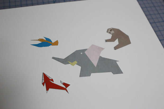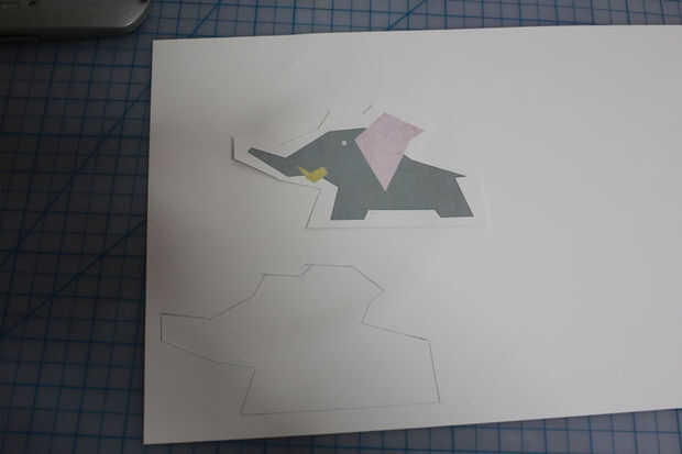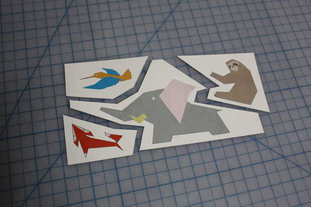 Dibujar cuatro animales diferentes con cualquier herramienta que te gusta (Adobe Illustrator, dibujos de mano, etc.) e impresión y lugarles en una hoja de cartulina (yo usé un palillo del pegamento para colocar ilustraciones impresas en ella). Cortar hacia fuera dividiendo a través de espacios entre ellos y recortarlo todo un poco para hacer que cada pieza tiene un contorno blanco natural algo razonable. Seguimiento de cada pieza en otra hoja de cartulina y recórtalo. Será cubierta en la parte posterior.