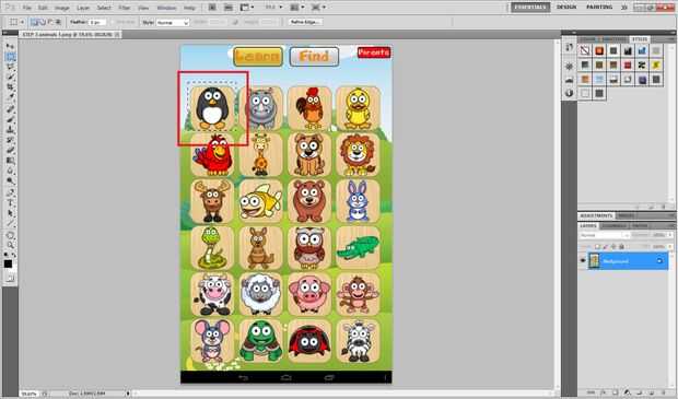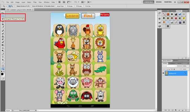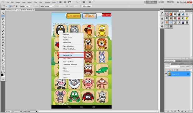 -Seleccione "Rectangular Marquee Tool", hacer un rectángulo alrededor de los animales y la señal derecha en el área seleccionada, haga clic en: Opciones > capa vía cortar.