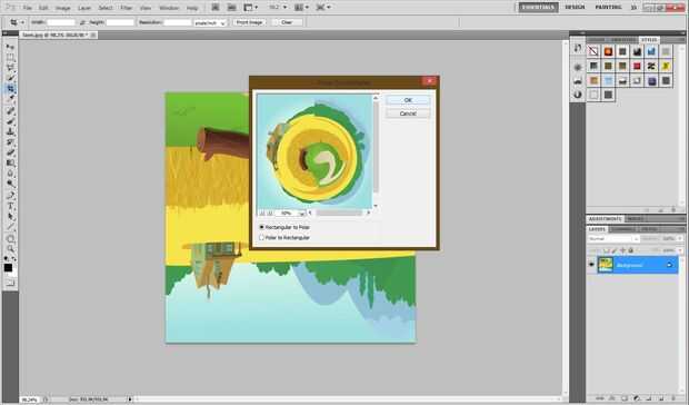 -Ahora elegir: Filtro > Distorsionar > coordenadas polares. En el cuadro de diálogo, seleccione la configuración "Rectangular a Polar". (Si estás usando The Gimp el comando es filtros > Distorts > coordenadas Polar.)