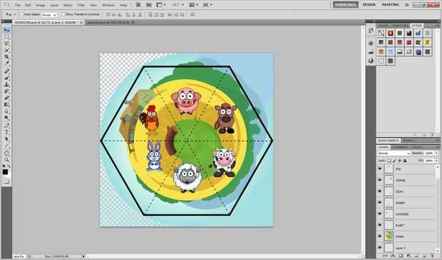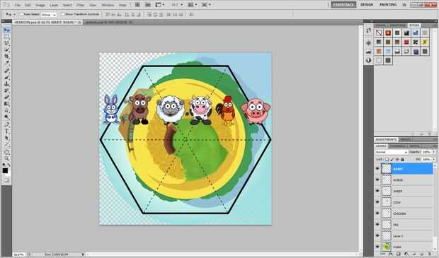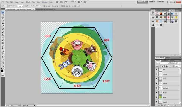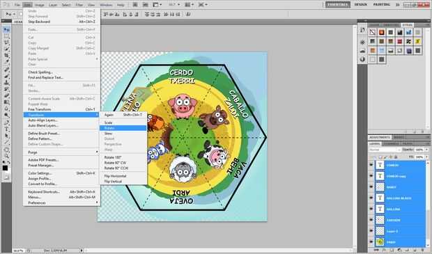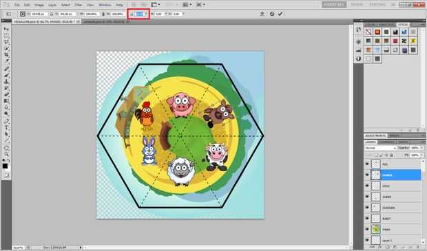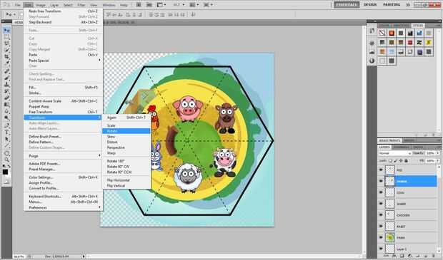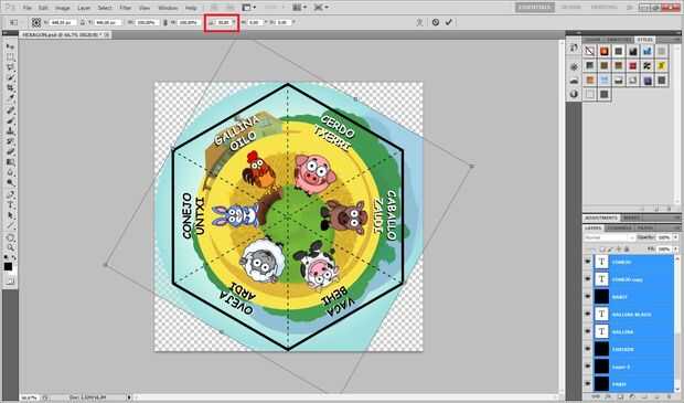 -Seleccione todas las capas y haga clic en Editar > Transformar > rotar y rotar todas las capas 30 º para que la esquina del hexágono está hacia arriba.