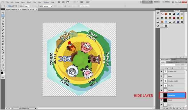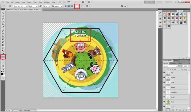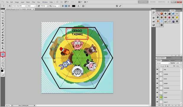 -Seleccionar "herramienta de texto Horizontal" y escribe el nombre de uno de los animales elegir negro como color de fuente. Entonces duplicar esa capa, seleccione el texto y cambiar el color a blanco. Mover la capa en la parte de atrás unos pocos píxeles a la derecha y hacia abajo para hacer una sombra que hace más fácil leer el nombre. Dependiendo del color del fondo (si es demasiado liviano) tal vez prefiera poner el texto negro en la parte delantera (vaca, oveja y conejo). Repita el proceso para cada animal.