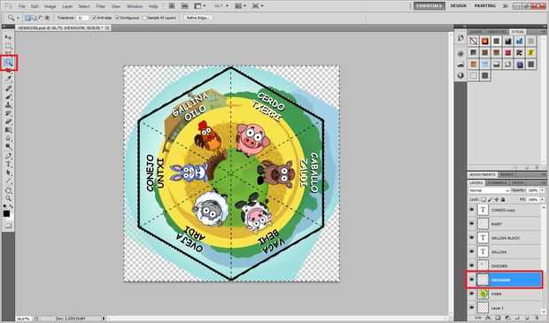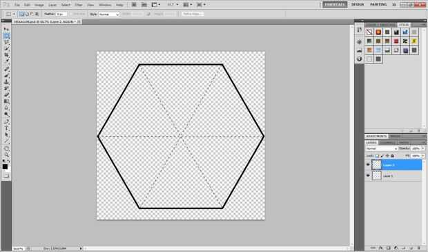 - Seleccione la parte exterior del hexágono usando la "Herramienta varita mágica", seleccione la capa del fondo y Borrar esa parte.