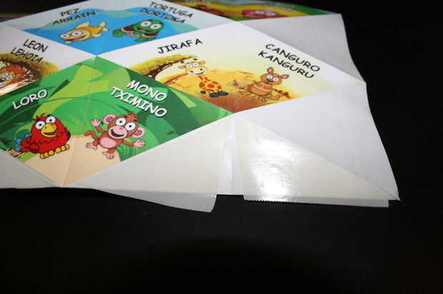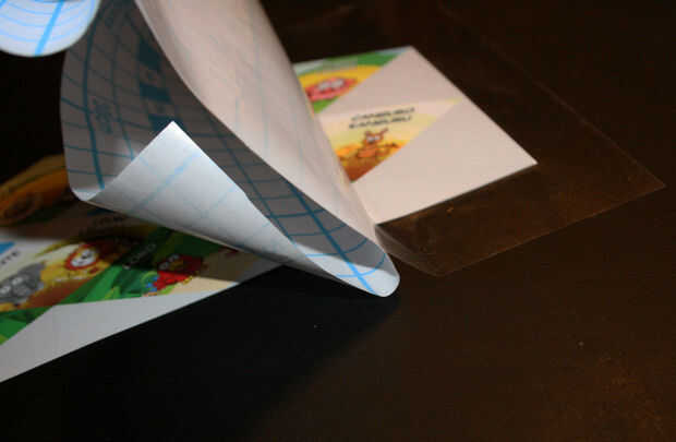 - Uso transparente unapelícula de libro dhesive para cubrirlo. Cortar la película a tamaño adecuado dejando 2 superávit de cm en cada borde. Retire el forro papel poco a poco y cubrir el caleidociclo con la película. Doblar la película sobra.