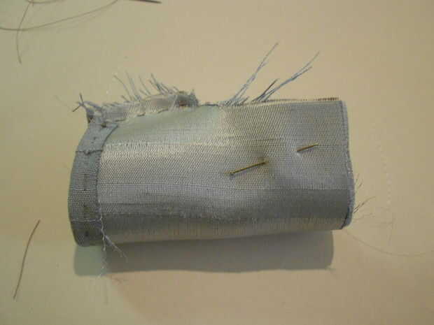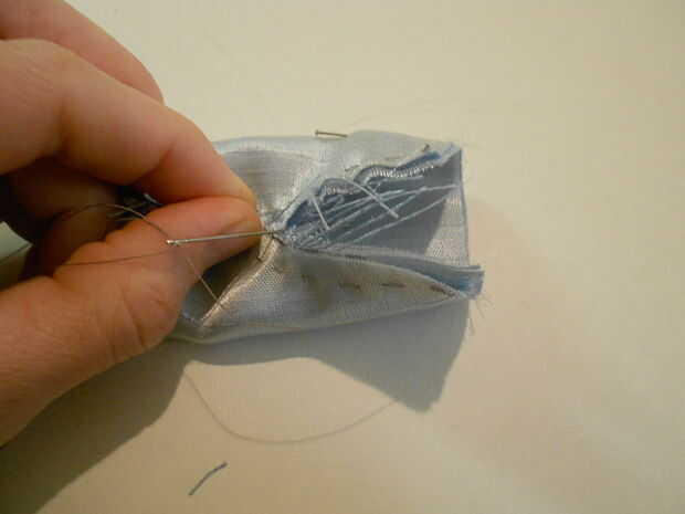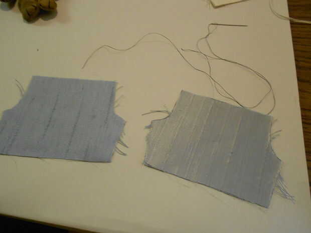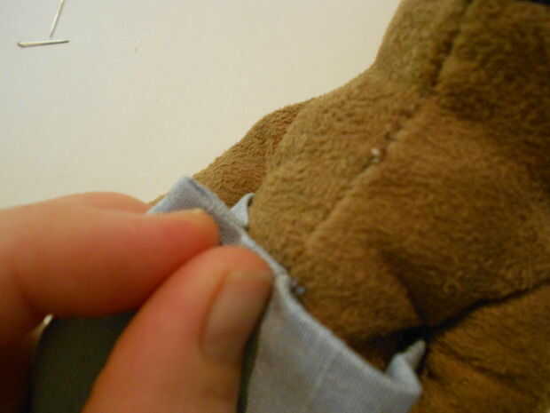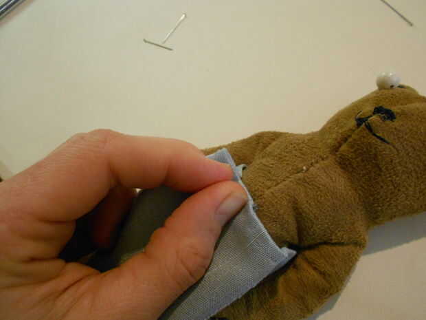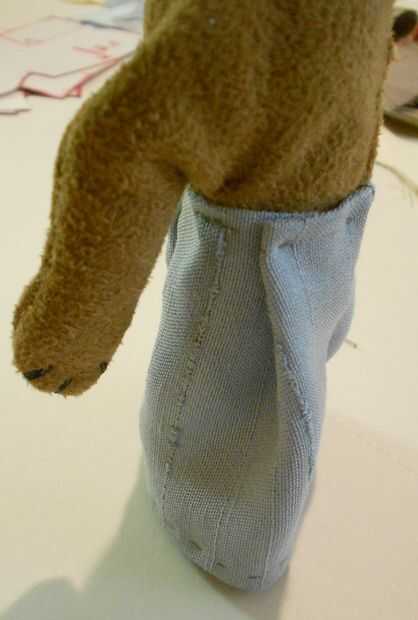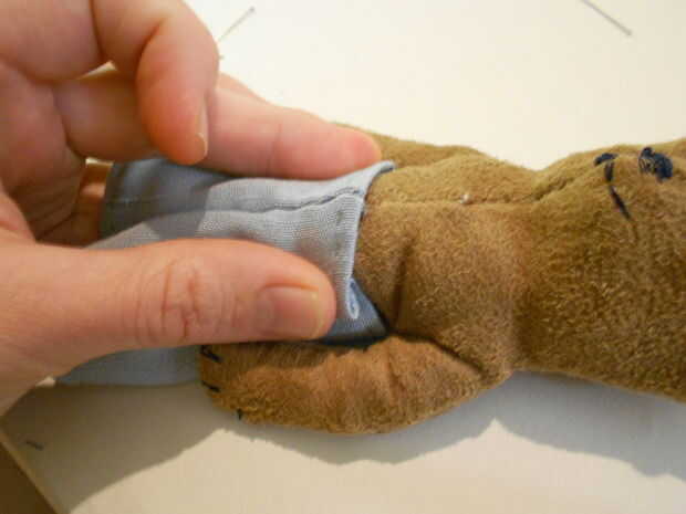 6. coser los pantalones para el oso de peluche para agregar pliegues del pantalón.