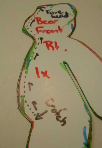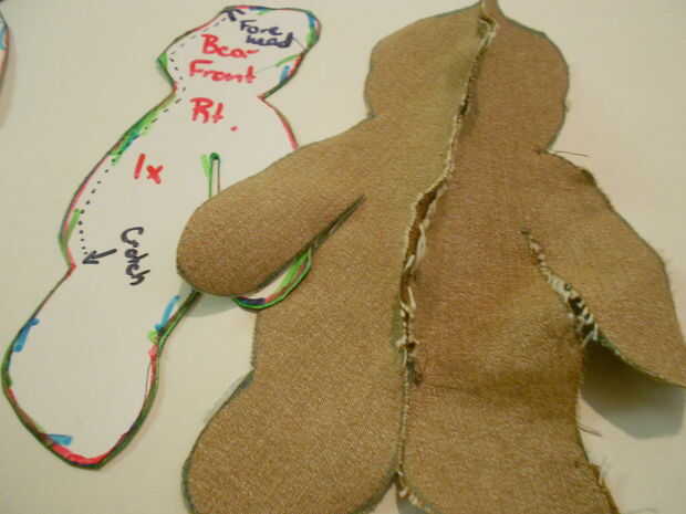 Pliegue juntos los dos frentes de su oso de peluche (los lados buena deben ser en el interior, los lados malos deben ser en el exterior). A partir de la entrepierna, coser el frente. Marqué la principal pieza aquí para una fácil lectura en negro con las flechas. Después de terminar, usted puede abrir el oso en el lado bueno a tus puntadas y asegúrate de que hiciste tus puntadas bastante pequeño. En general, debe 5-8 puntadas por pulgada para realista, unir el oso.