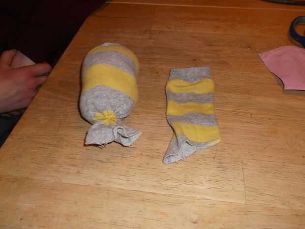 ... LA COLA DEL CALCETÍN PERO DEJAN LO SUFICIENTE PARA PODER ATAR CON UNA CINTA ELÁSTICA. RECORTE EL EXCESO DE MATERIAL.