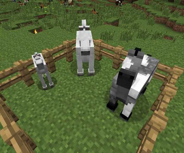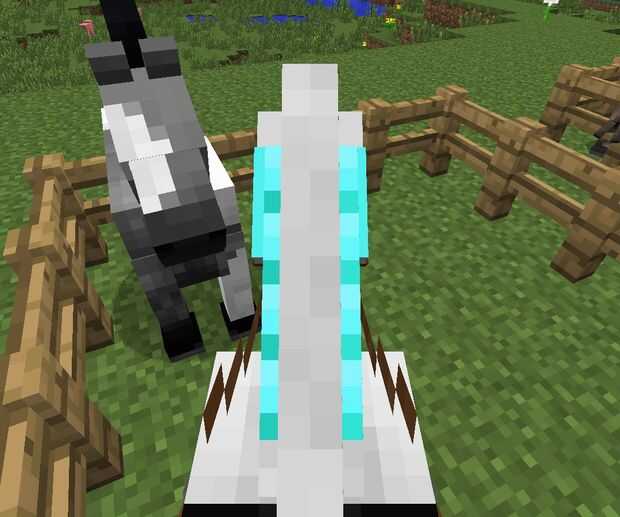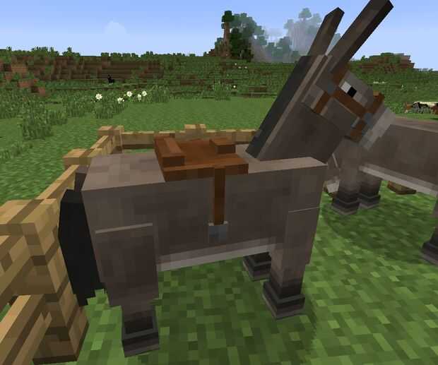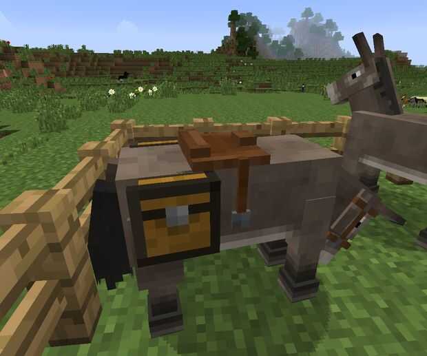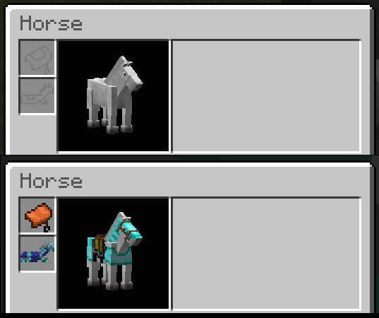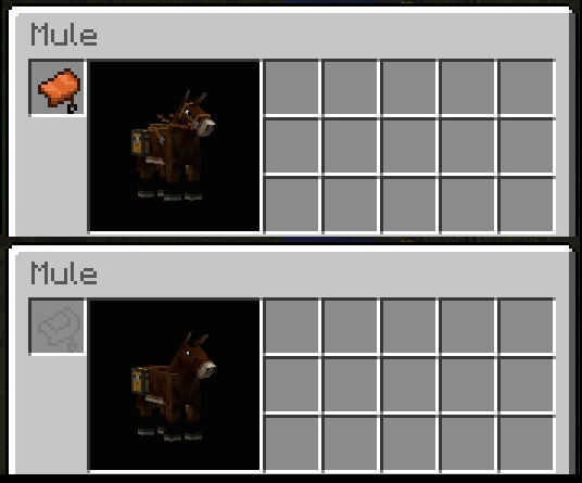 - No puede equiparse con armadura, pero puede equiparse con una silla de montar y el pecho una vez domesticado (proporciona 15 ranuras de inventario) (pecho no se puede quitar una vez equipado a menos que el animal muere, luego se quitarán)