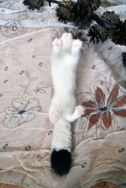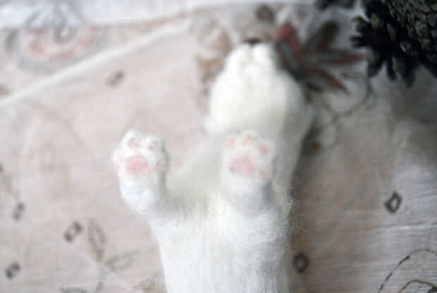 Envuelva el limpiador de pipa en la parte inferior en merino itinerante y sentí hasta que esté ligeramente densa. Usando un hilo de color similar, hacer varios bucles y tire de él para crear el número correcto de muescas para los dedos del pie. Una vez finalizado, se sentía en una pequeña cantidad de merino entre los dedos para cubrir el hilo.